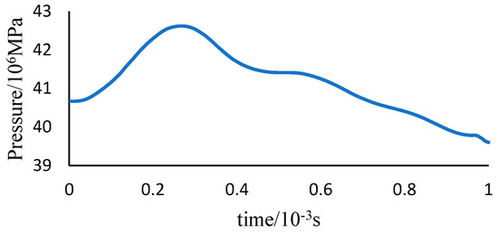 The characteristics of fracture initiation and propagation in radial well deflagration fracturing are studied using a 2D model. The 2D radial well geometry and parameters are shown in Figure 5. The model has a size of 20 m × 10 m, and the radial well has a length of 15m and a diameter of 0.04 m. The radial wellbore is filled with gunpowder uniformly. The radial well is meshed with 39,211 CPS4 (four-node plane stress unit) units. The reservoir has a Young’s modulus of 15 GPa and a Poisson’s ratio of 0.25. The maximum horizontal principal stress is 41 MPa in the Y direction, and the minimum horizontal ground stress is 36 MPa in the X direction. The effect of deflagration on the borehole wall is set as the surface force. According to the curve of stress and action time (p-t curve) in deflagration fracturing reported previously, the load amplitude is determined, as shown in Figure 6 [30,31]. The rock density is 2600 kg/m2, the fracture energy parameter , and the fracture characteristic length in the phase field lc = 0.5 mm. No hardening or strain penalty is applied (H = 0), and the time step is set as Δt = 103 s. The equations for the finite element model are nonlinear, and they are solved with the incremental iterative method. The model is established in commercial software such as Comsol or Abaqus, and the built-in nonlinear solver is applied. The Newton-Raphson algorithm and automatic time step scheme are applied.