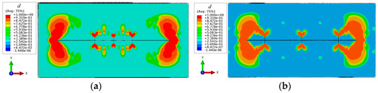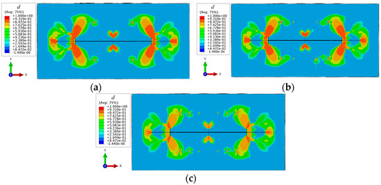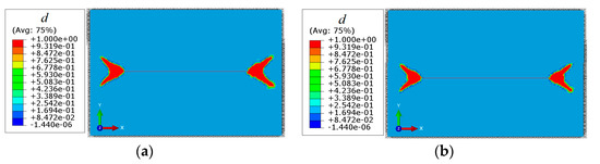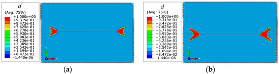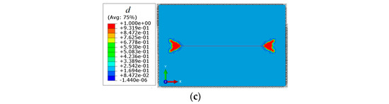 The mode I fracture of the single-edge notched tension (SENT) proposed by Philip K. Kristensen et al. [29] was simulated with the numerical model in this study. The mathematical symbol d of the phase field order parameter was used in the modeling process, which is equal to Φ in the control group. The numerical simulation results and the curves of force versus displacement are shown in Figure 2, Figure 3 and Figure 4.