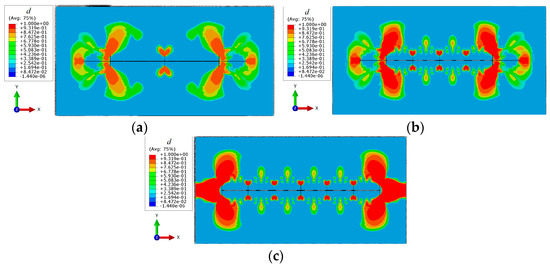 Simulation of fracture propagation under different micro-fractures. (a) 2 micro-fractures between natural fractures; (b) 4 micro-fractures between natural fractures; (c) 6 micro-fractures between natural fractures.