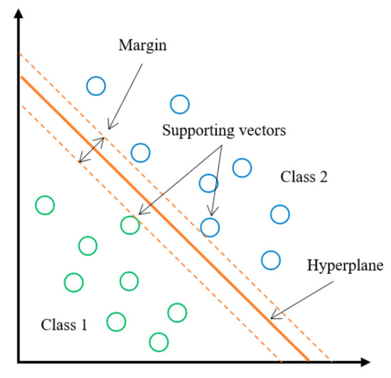 Figure 1. Because many hyperplanes could be generated to classify the data, only the best hyperplane is selected. The two closest hyperplane datapoints are defined as supporting vectors, and the distance between them is defined as the margin. The best hyperplane will be the one that optimizes the margin.
