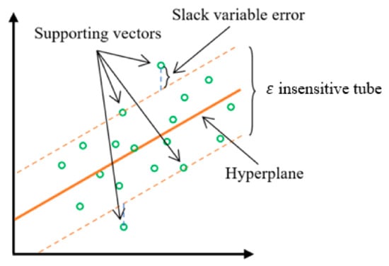 that envelops most of the datapoints. The points inside the tube are not used for error calculation since they are within the tolerance level (margin). This tube is optimized by minimizing the error of the slack variables (datapoints outside the tube). In SVR, the supporting vectors will be the datapoints outside the tube and on its boundaries, as shown in