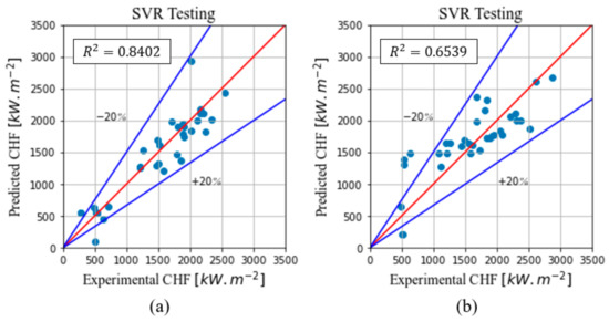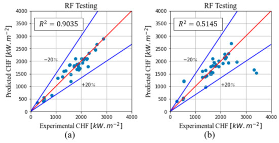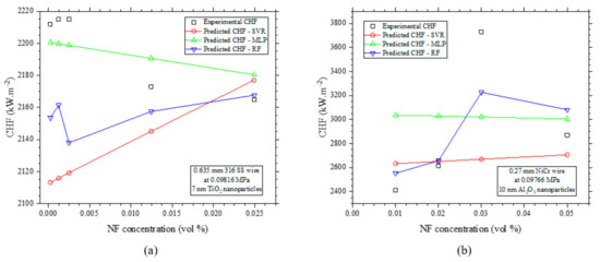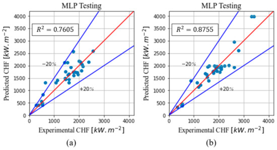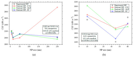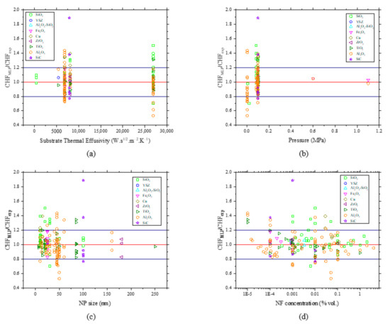 Figure 22a,b do not present very dispersed data. In fact, only a small number of substrates were used in all the experiments, while most of the studies performed atmospheric pressure NF pool boiling experiments. It also shows that the predictions were not biased toward any specific NP, which emphasizes the fact that the MLP model can be a powerful tool to predict the CHF in NF pool boiling experiments.