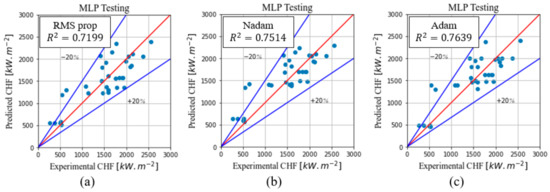 Figure 21 shows that the MLP predictions are more accurate than Kandlikar’s predictions. Furthermore, Kandlikar’s model requires the receding contact angle, which, in most cases, is not measured in the studies. Thus, MLP provides much simpler and more straightforward predictions based on training using a database and the NF’s main characteristics.