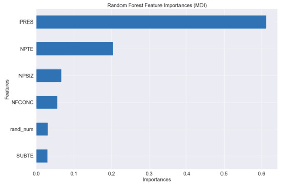 Figure 13, the importance bar for substrate thermal effusivity (SUBTE) is smaller than the random number one, meaning that this feature was not important for the model. This first importance evaluation was compared to the other two models. The MDI model is known for its limitation in relation to high cardinality features. In general, they are more biased toward high cardinality features than to low ones.