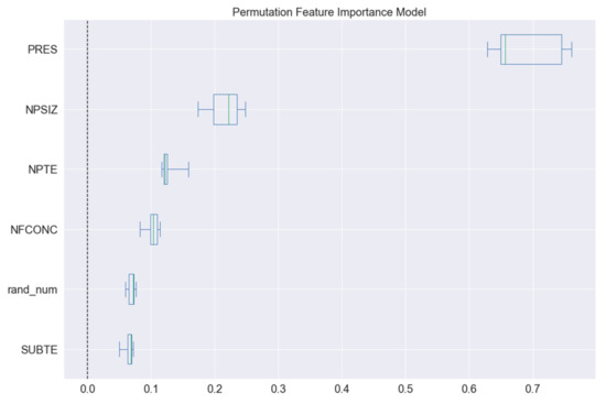 Figure 14, in all the permutations pressure was the most important feature, as one might expect, followed by NP size, while substrate thermal effusivity was the only feature that exhibited smaller importance than that of a random number. The results obtained by this importance evaluation are slightly different from the one provided by the RF regressor (MDI). However, both models agree that pressure is the most important feature, NP size is the second most important, and substrate thermal effusivity is not important to the model. The most common plot form used to present a permutation feature importance is the merging of all the permutations, as shown in