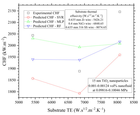 Figure 20, all three models were able to capture the trend of CHF based on substrate thermal effusivity, even though it had a small effect on CHF, as concluded from the feature importance of previous analyses. Again, RF and MLP were the ones providing the best CHF prediction values.