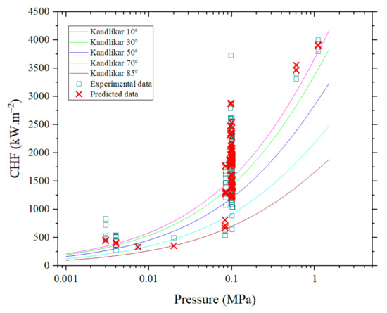 Based on the analyses previously discussed in this section, it can be concluded that the systematic development of the ML models successfully demonstrated the quantitative contributions of each parameter on the CHF enhancement, with SVR presenting the less accurate CHF predictions, while RF and MLP presented the most accurate CHF predictions. As the MLP model also showed lower variability compared to the RF one, the built MLP model was applied to generate CHF predictions, which were compared to the database values and to Kandlikar’s model [