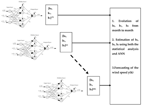 Due to the nature of large wind randomness, it is important to select periods of random wind speed persistence. Consequently, it is intended to use the dataset for both hourly and daily prediction with different selections for short-time and long-time forecasting cases. For the hourly forecasting, only 100 appropriate days are selected for the analysis of this study due to being exposed to noticeable seasonal variations. The exposed days are divided equally into 10 periods of 10 days each. The wind speed is selected 4 times a day, covering an average of 6 h each in which normal potential variations can exist, making it suitable for the goal of this study. For the daily forecasting, wind regime exploitation of the entire 12-month period is used with daily average values for each month. Another difficulty of accurate forecasting is the size and amount of calculating for each Volterra kernel for the selected period. For instance, an N perception neuron network requires m ( N 2 + N + 1 ) calculations for up to the m-order kernels, and for each period that is considered for this study. The prediction of these kernels requires neural networks for each kernel to be determined. In this work, 2-layer NN with only 4 neutrons is chosen, which makes network training inaccurate and difficult.