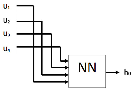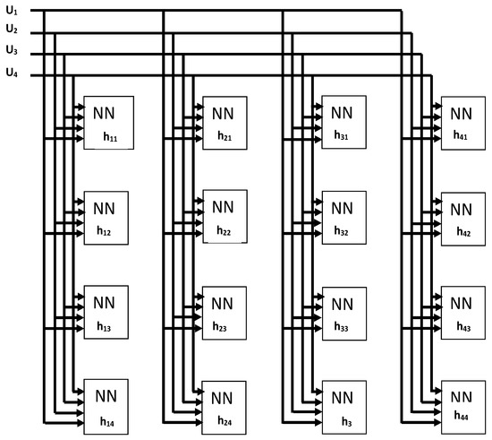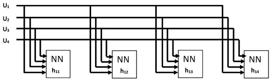 Once Volterra kernels are extracted from previous periods, different sizes of neural networks are further used to predict evaluated values of the h0, h1, and h2 kernels for future estimation. Figure 4, Figure 5 and Figure 6 display the neuro networks which are implemented to extract h0, {1 × 4} h1, and {4 × 4} h2, respectively.