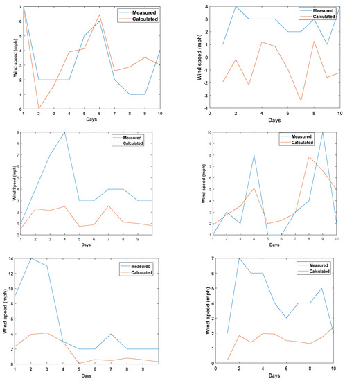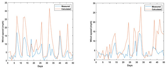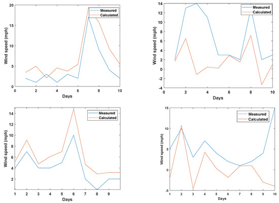 It can be seen from Table 4 that the average error is 1.9383 mph and from Table 5 the average error is 2.3241 mph for the investigated 100 days, which can be tolerated considering the hyperparameter errors associated with the implemented algorithm. Table 6 depicts a comparison between the implemented algorithm in this study with two other methods for the same datasets: the temporal metrological method [25] and the error extraction method [26].
