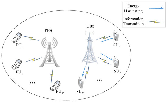 To improve the performance of the CRIoT network with SWIPT, some resource allocation schemes have been proposed to improve network performance [10,11,12,13,14]. Mokhtarzadeh et al. [10] considered a CR network (CRN) in which each SU was equipped with a multi-antenna full-duplex transceiver. They optimally allocated spectrum resources to maximize the throughput with permissible interference to PU. Das et al. [11] studied a cooperative EH-CRN. When PU was present, the optimal number of SUs served as relay to cooperate in PU transmission, otherwise each SU transmitted its own data. Xu et al. [12] proposed a distributed resource allocation strategy to solve the power minimization problem in a multi-user CRN with SWIPT. They jointly optimized the transmission power and the power allocation ratio in ideal channel status information (CSI) and non-ideal CSI, respectively. Camana et al. [13] studied the multiple input single output (MISO) CRN with SWIPT in a rate-splitting multiple access (RSMA) framework. The transmit power of the cognitive base station (CBS) was minimized under the constraints of minimum energy harvest, minimum data rate, and permissible interference to PU. Zhou et al. [14] studied a MISO cognitive radio downlink network. The goal was to make a tradeoff between the transmit power of the CBS and the energy harvested by an EH receiver. Yang et al. [15] studied an optimal time and power resource allocation scheme to maximize uplink sum throughput while satisfying the minimum downlink transmission requirements and energy harvesting requirements of the users. However, in the above literature, they did not consider the spectrum sensing process, which is essential for CR networks.