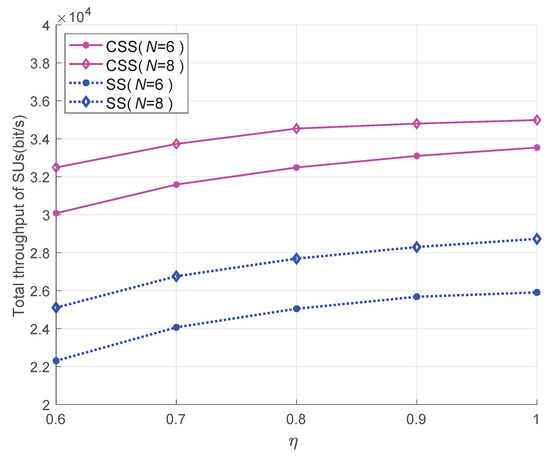 Figure 3 shows the variation of the total throughput of single user sensing (SS) scheme and CSS scheme with different energy harvesting efficiency. It can be seen from Figure 3 that, CSS obtains higher total throughput than SS. This is because in CSS, the cooperation of SUs can increase the detection probability and decrease the false alarm probability, leading to an increase in the total throughput. It also can be seen from Figure 3 that with the increase in the energy harvesting efficiency, the total throughput increases, since more energy can be used for transmission. The larger N also leads to the larger total throughput, since more SUs can sense more eligible channels for transmission.