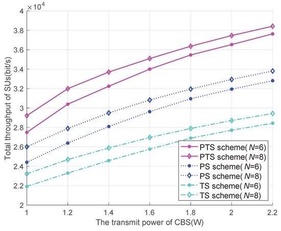Figure 4 shows the variation in the total throughput of different SWIPT schemes versus the transmit power of CBS. It can be seen from Figure 4 that jointly using PS and TS scheme, denoted as PTS, can obtain higher total throughput than only using PS scheme or TS scheme due to more flexible power allocation. It also can be seen from Figure 4 that the total throughput increases with the transmit power of the CBS. This is because the high transmit power can easily meet the energy requirement of each SU. Thus, more power can be used to perform ID at the SUs leading to the increase of total throughput. The more SUs can also obtain higher total throughput, since more eligible channels can be sensed for transmission.