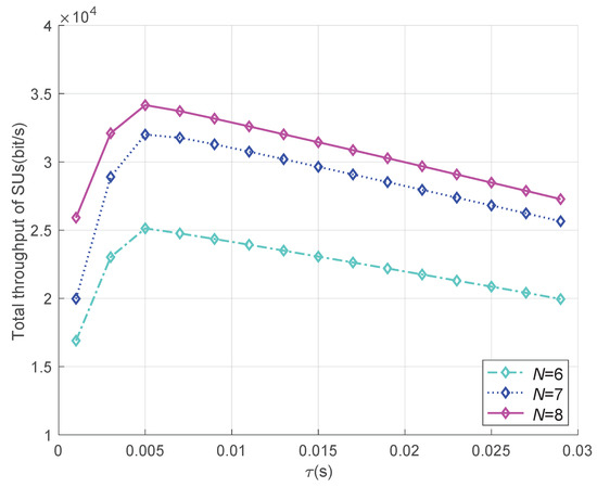Figure 7 shows the total throughput of the SUs versus different sensing durations. It can be seen that with the increase of sensing duration, the total throughput firstly increases and then decreases. That is because when the sensing duration is short, the creasing sensing duration can improve the sensing accuracy so as to increase the total throughput. However, the increase in the sensing duration will lead to the decrease of data transmission time in fixed time slots, resulting in the decrease of the total throughput. Therefore, there is a trade-off between the sensing performance and the total throughput of the cognitive network; there is an optimal sensing duration to maximize the total throughput. In addition, the total throughput increases with the number of SUs, since more SUs participated in CSS can improve the detection accuracy and find more eligible channels, so as to improve the system throughput.