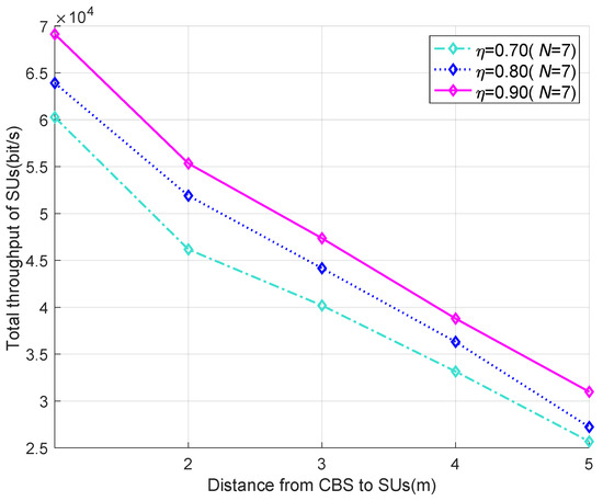 Figure 8 shows the total throughput varies with the distance between the CBS and the SUs under different eta. It can be seen that, the shorter the distance between the CBS and the SUs, the higher energy and throughput can be obtained. This is because the shorter the distance between the CBS and the SUs, the more energy can be harvested, leading to the greater total throughput. Higher eta also causes more total throughput, since the required energy can be harvested faster and more time can be used for transmission.