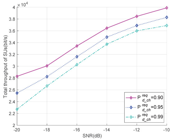 Figure 9 shows that the total throughput varies with the mean SNR values under different detection probability requirements . It can be seen from Figure 9 that, as the SNR increases, the system total throughput increases. This is because a higher SNR leads to a larger detection probability of the channel and a lower false alarm probability, so as to achieve a higher system total throughput. It also can be seen that, with the increase of detection probability requirement, more channels can not meet the detection probability requirement, thus the total system throughput decreases.