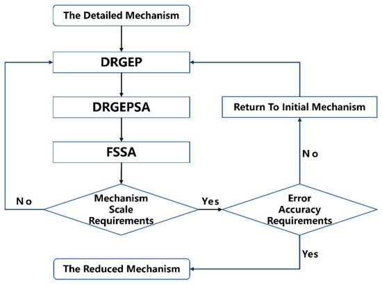DRGEPSA, which stands for the direct relationship graph method for coupled error propagation and sensitivity analysis [45], utilizes DRGEP in combination with sensitivity analysis (SA). The overall calculation results are influenced by specific reaction parameters. The sensitivity analysis refers to the changes in the overall calculation results that occur due to variations in the reaction parameters. In the process of mechanism reduction, the DRGEP method is used first, and then the SA method is used to analyze the sensitivity of the tested substances to the major species. According to the degree of influence of each elementary reaction on the total reaction process, the species or reactions with less influence were deleted, and substances with less sensitivity were removed. Because the removed material and materials are in a nonlinear coupling state, the removal results often produce large errors; therefore, the mechanism reduction can only be carried out on a certain calculation node (space point or time point), and a large amount of calculation is required to obtain the reduced mechanism of the entire calculation area. The sensitivity analysis method is limited in its application to complex combustion problems due to its inability to simultaneously achieve both size and accuracy requirements for a reduced mechanism.