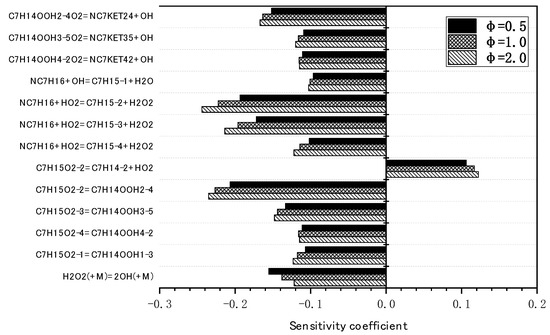 During the practical operation of an internal combustion engine, the temperature within the cylinder at the point of fuel injection initiation is under 1000 K, thereby aligning with the low-temperature oxidation reaction phase. In the detailed kinetic mechanism of n-heptane, the low-temperature oxidation reaction stage [47] is mainly n-heptane, which first dehydrogenates with small molecules such as O2, OH, and HO2 to form n-heptyl R·; N-heptyl reacts with O2 to form peroxyalkyl RO2, and then the isomerization of peroxyalkyl is converted into isomer QOOH of peroxyalkyl, and the secondary oxygenation of isomer QOOH produces O2QOOH; alkyl hydroperoxide dissociates into relatively stable ketone hydroperoxide and hydroxyl radicals, which are further decomposed into alkenes and CO. Sensitivity analysis [48] for the ignition delay time can determine the reactions that play a key role in the mechanism. Figure 2 shows several groups of reactions with the highest sensitivity to the ignition delay time of n-heptane in the detailed mechanism at an initial temperature of 900 K, initial pressure of 10 ATM, and different equivalence ratios. According to [49], a positive sensitivity coefficient implies the inhibition of the reaction, whereas a negative sensitivity coefficient implies the promotion of the reaction. Figure demonstrates that the mole fraction of n-heptane is mainly influenced by two reactions. These reactions are the isomer conversion of peroxyalkyl and the dehydrogenation reaction of fuel, which is associated with free radicals such as OH and H2O. The dehydrogenation reaction is the most significant reaction during the low-temperature stage. Out of the four isomers resulting from the dehydrogenation of n-heptane, namely C7H15-1, C7H15-2, C7H15-3, and C7H15-4, among which C7H15-2 and C7H15-3 were found to be the most sensitive species. In the construction of the reduced mechanism for n-heptane, only the aforementioned reaction groups significantly affect the reactivity of the system in the low-temperature reaction zone. Thus, the relevant species and reactions from the remaining reaction groups can be eliminated.