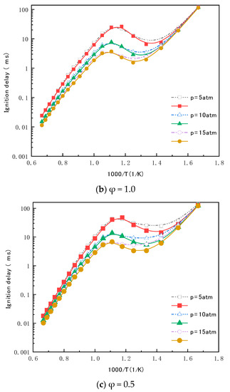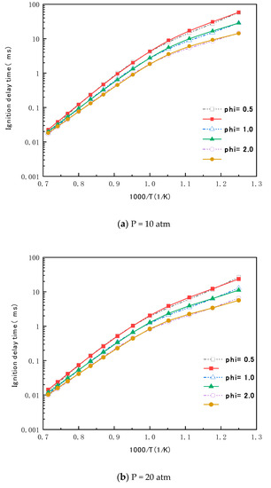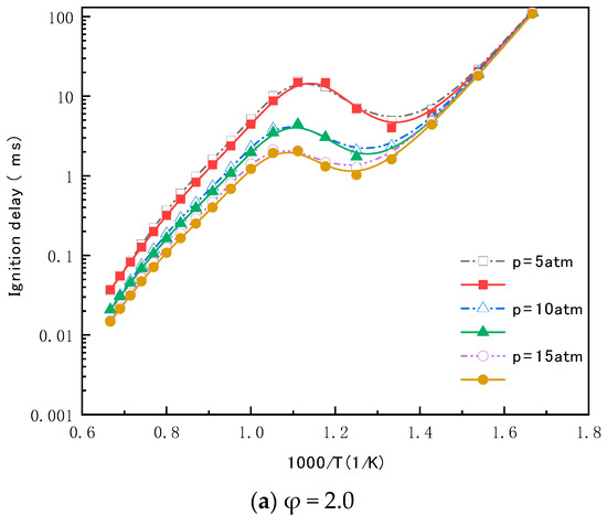The ignition delay time of fuel is a crucial characteristic for evaluating its combustion efficiency and serves as a significant reference point for validating the combustion reaction mechanism and chemical kinetics model [51]. Simulation experiments were conducted in a zero-dimensional homogeneous closed reactor in CHENMKIN to study the effectiveness of the reduced mechanism of n-heptane in predicting the ignition time. A simulation was conducted to determine the ignition delay of n-heptane in the shock tube. To ensure the comprehensiveness of the simulation test, the mechanism was compared with the detailed mechanism under oxygen-poor, oxygen-rich, and stoichiometric fuel conditions. Figure 4 shows the ignition delay time data for the reduced and detailed mechanism calculations at various pressures for equivalence ratios of φ = 0.5, 1.0, and 2.0. By comparing the simulation data obtained by the reduced mechanism with the calculation data obtained by the detailed mechanism, the reduced mechanism can accurately predict the variation in the ignition delay time with the temperature under different boundary conditions. This indicates that the simulation results obtained from the reduced mechanism closely match the calculated values of the detailed mechanism, and there is a high degree of curve fitting between the two mechanisms.