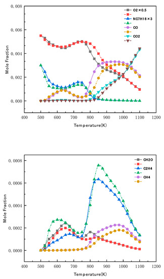 N-heptane is widely used as a substitute for diesel fuel, because its cetane number (56) is similar to that of diesel fuel (about 40–55), and it has a complete and detailed chemical reaction kinetics mechanism, so it has become a substitute for the paraffins of diesel fuel in the study of a combustion mechanism [22,23,24]. Regarding the problem of needing a large number of experimental data to perform the graph comparison in the process of a detailed mechanism construction, M.S. Bornardi et al. proposed the curve-matching (CM) method to evaluate the consistency of the model and experimental data, which was successful. Comparison and evaluation of different kinetic mechanisms of n-heptane. Ref. [25] A kinetic model of n-heptane was constructed by Curran et al. This mechanism divides the important reactions in n-heptane oxidation into 25 different reaction categories, among which 10 reaction categories describe the high-temperature oxidation process and 15 categories describe the low-temperature oxidation process. Although some less important reactions (such as the consumption of heptene isomers) are approximated, the overall performance of the mechanism is good and provides a basis for the development of kinetic mechanisms for larger molecular weight straight-chain alkanes. Ref. [26] Pelucchi et al. proposed a kinetic model for n-heptane that highlights a new class of reactions that produce organic acids, diketones and ketones in low temperature reaction systems. The mechanism was experimentally validated under conditions including low and high temperature ranges. Good agreement was found between the simulation results and experimental data such as ignition delay time, substance concentration distribution, and laminar flame velocity of the fuel under equivalent operating conditions [27].