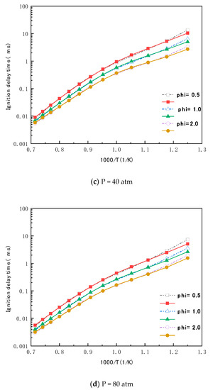 The analysis and comparison of the ignition delay time, calculated by reduced and detailed mechanisms of n-butanol, were conducted for varying initial pressures (P), temperatures (T), and equivalence ratios (φ), and are displayed in Figure 6. Data for predicting the ignition delay time at different equivalence ratios and pressures (10, 20, 40, and 80 ATM) are shown in Figure 6a–d as a function of temperature. It can be seen from figure that the simulation calculation results of the reduced mechanism under different boundary conditions are close to the simulation calculation results of multiple detailed mechanisms, which can accurately describe the trend in the ignition delay time of the detailed mechanism with temperature, particularly for the low-temperature region where the combustion reaction is more complex, and the ignition delay time prediction results of the reduced mechanism are also in good agreement. According to the findings, the decreased n-butanol mechanism exhibits an effective capability in forecasting ignition delay.