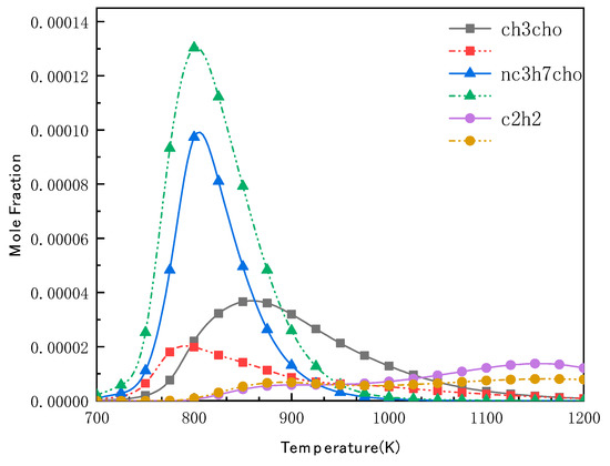 For the n-butanol reduced mechanism composed of 82 species and 383 reactions, Figure 7 shows the change in the mole fraction of the principal species in the combustion process calculated using the n-butanol reduced mechanism and the detailed mechanism, respectively, in PSR. The initial temperature was 700 K–1200 K, the pressure was 10 ATM, and the equivalence ratio was 1. As shown in figure, the reduced mechanism has good consistency in predicting the mole fractions of fuel NC4H9OH, significant intermediate species NC3H7OH, CH3CHO, C2H4, C2H2, and products CO, CO2, and H2O, among which the mole fractions of H2O and CO were well predicted in the low-temperature region. In the middle- and high-temperature regions, there existed a minimal discrepancy between the forecast made by the simplified model and the comprehensive model. The mole fractions of CH3CHO and NC3H7CHO were well predicted in the low- and high-temperature regions, but there was a certain difference in the middle- and high-temperature regions. In the middle and high-temperature regions, there existed a minimal discrepancy between the forecast made by the simplified model and the comprehensive model.
