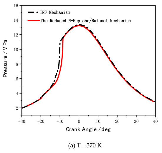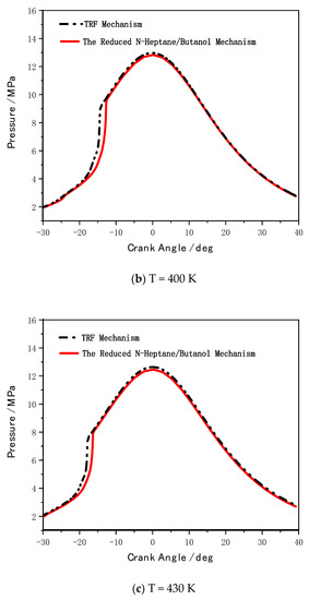 The results are shown in Figure 8. The reduced mechanism accurately predicted the ignition and combustion timing of HCCI under various temperature conditions, as evidenced by Figure 8 and in agreement with the results from the TRF mechanism. The HCCI combustion process of mixed fuels comprising n-butanol and n-heptane can be accurately described by the proposed reduced mechanism model.