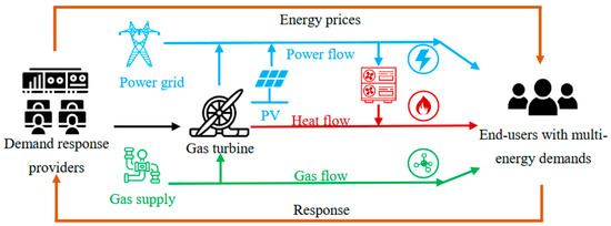 Demand response (DR) has emerged as a promising solution for effectively managing energy systems in multi-energy microgrids [6,7,8,9]. DR programs can be broadly classified into two categories, namely price-based DR [10,11] and incentive-based DR [12,13,14]. The former adjusts dynamic price signals to reshape the load profiles of the end participants, while the latter provides rewards or compensation to loads for reducing peak demand. Although both types of DR have facilitated the development of demand-side management, price-based DR is more prevalent and convenient for demand response providers (DRPs) in practice. This is because the dynamic pricing signals, which are integral to price-based DR, offer a more responsive and flexible approach for optimizing energy consumption patterns compared to incentive-based DR [15]. Therefore, this paper primarily focuses on price-based DR from the DRPs’ perspective.
