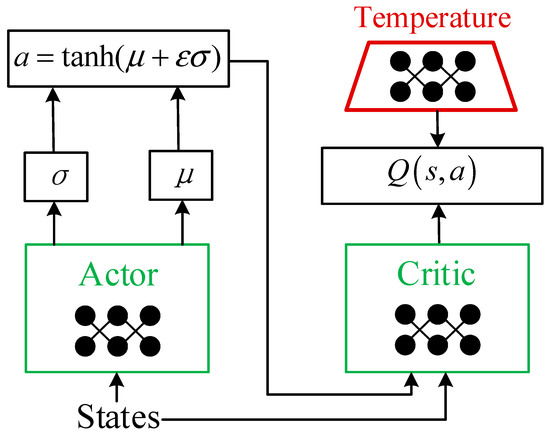 Figure 2 depicts the architecture of the SAC algorithm, which is comprised of three fully connected neural networks: the Actor, Critic, and temperature parameter networks. The Critic network is parameterized by and is trained to approximate the soft Bellman optimal equation. To address the overestimation of Q values, the clipped double DQN is adopted with target networks parameterized by .