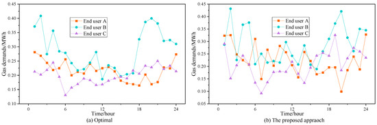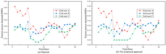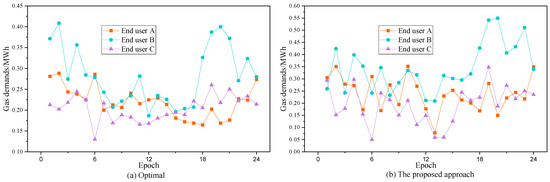 By investigating the effectiveness of the bi-level model and policy neural network in regulating end users’ demands under multiple sources of uncertainties, we gain valuable insights into the adaptability of the proposed approach, as shown in Figure 8 and Figure 9. Our results reveal that the policy neural network can effectively learn the preferences of different users’ electricity and gas demands, closely approximating the optimal curve calculated by the bi-level model. Specifically, in terms of electricity demands, the neural network achieves an average error of 0.037 MWh compared to the bi-level model, while for gas demands, it yields an average error of 0.056 MWh. These results validate the effectiveness and adaptability of the proposed approach, demonstrating its capability to handle random fluctuations and uncertainties.