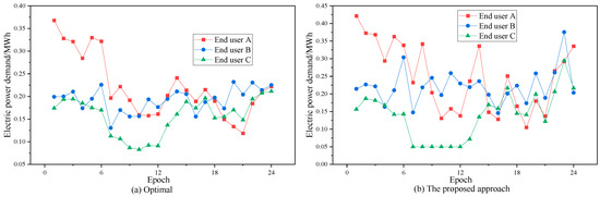 This part presents the results of the training process of neural networks based on deterministic data, which has been conducted over 10,000 epochs, as depicted in Figure 3. The effectiveness of the deep reinforcement learning (DRL)-based framework has been evaluated by calculating the ratio of the optimal return obtained by the bi-level model and that achieved by the neural network. It should be noted that the bi-level model was provided with the full private preferences of the end users, whereas the proposed DRL-based approach does not require any prior information. The graph shows that the ratio of the neural network varies significantly between 0.90 and 0.67 in the first 2000 training epochs due to the SAC algorithm, which encourages exploration and makes the neural network more inclined to choose actions with higher entropy to explore the action space. These actions are seldom selected, thereby enhancing the accuracy of the neural network for global value estimation. As the number of training epochs increases, the temperature neural network continually updates its own parameters, and the reward for action space exploration is gradually reduced. As a result, the policy neural network begins to choose the optimal strategy based on the current Q-function fitting. Therefore, the ratio increases rapidly to 0.95 from the 2000th to the 4000th training epoch, indicating that the neural network has an excellent ability to learn the optimal strategy. After the 4000th training epoch, the performance of the neural network becomes stable, and it converges around 0.97.