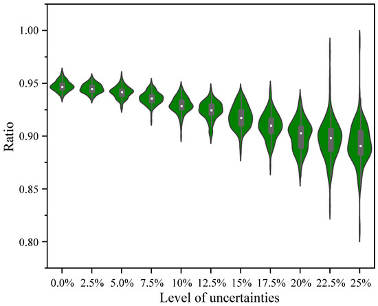 In the final analysis, the generalization ability of the proposed DRL-based approach is tested. The parameters of the policy neural network are first fixed after training, and the level of uncertainties is then adjusted to evaluate the neural network’s generalization ability. Specifically, 100 scenarios are generated for each uncertainty level, and the results are shown in Figure 10. The green portion of the figure represents the probability density distribution of the ratio under a given level of uncertainty, while the black rectangle represents the range of 25% and 75% quantiles, and the white square represents the median. It can be observed that as the level of uncertainty increases gradually from 0% to 25%, the ratio as a whole remains at a good level. When the uncertainty level is not higher than 12.5%, the median ratio is higher than 92%, which indicates that the policy neural network has a strong generalization performance.