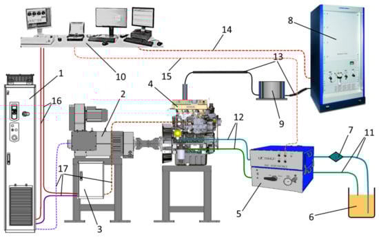 Engine test bench setup: 1—regenerative drive; 2—AC dynamometer; 3—test engine control box with throttle actuator; 4—Kohler engine; 5—fuel measuring device AVL KMA Mobile; 6—fuel tank; 7—fuel filter; 8—multicomponent exhaust gas measurement system AVL SESAM FTIR; 9—heated filter; 10—operator interface with data recording and measuring device control computers; 11, 12—fuel lines; 13—heated gas line for exhaust gas measurement from the exhaust tailpipe; 14—AVL SESAM FTIR data communication cable; 15—AVL KMA Mobile data communication cable; 16, 17—dynamometer and test engine communication cable.
