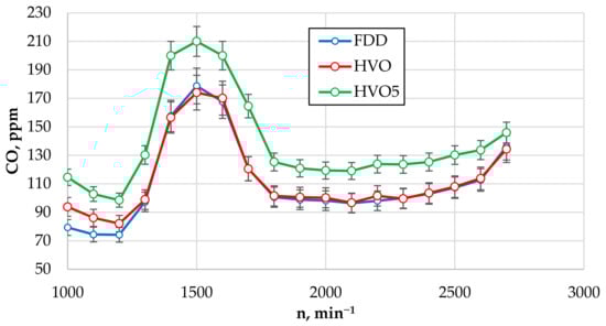 Variations in the content of CO, CO2, HC, and NOx in exhaust gases engine operating with three different fuels after data processing (confidence level—95%) are given in Figure 4, Figure 5, Figure 6 and Figure 7. In total, from 5–7 repetitions performed with each fuel, at least four were left for data processing, similarly as for the analysis of power, torque, and fuel consumption data.