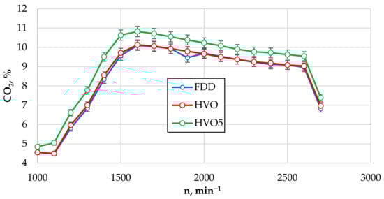 In the case of pure HVO, the content of CO2 emissions in the entire range of engine crankshaft revolutions in comparison to FDD increased by an average of 0.9%, and this difference is considered insignificant, but using HVO5, it increased by an average of 8.4% (see Figure 5).