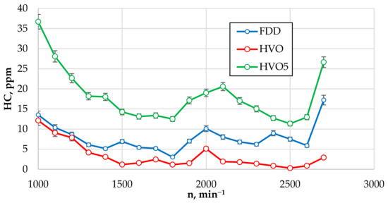 In the case of using pure HVO, the content of HC in emissions in the entire range of engine crankshaft revolutions decreased by 60% on average in comparison to FDD, but using HVO5, it increased by an average 1.45 times (see Figure 6).