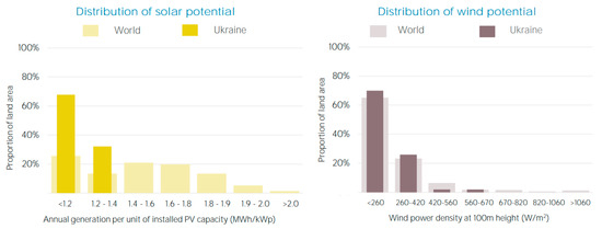 The dynamics of changes in RES electricity generation in Ukraine differ from the rest of the world because of the present war conditions, so they need to be investigated in more detail. Data from IRENA for Ukraine RES generation are presented in Figure 3 and Figure 4. In IRENA online resources, in terms of RES potential, the local solar power potential in Ukraine can be classified into seven groups. Every group represents one range of annual PV production per nominal unit of installed capacity (kWh/kWp/yr). The presented chart shows the percentage of the selected country’s applicable area in every class and the total distribution of applicable area inside all classes as a numerical comparison.