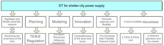 Digital transformation helps to decarbonize the energy supply, decrease dependency on fossil fuels, and integrate renewables in PSs while increasing their resilience [9]. RESs can also be used for the power and heat supply of shelter cities. A shelter city is a community of citizens (refugees) who lost their homes in war conditions. The building of shelter cities generates problems in existing PSs and also impacts the power quality in the affected power grid. The development of digital solutions and Digital Twins (DT) also makes this application more reliable and affordable. The global DT market size is expected to reach $41.77 billion in 2026 [10]. DT implementation developed and adopted for war or post-war PS conditions can make shelter city prosumers, and thus another benefit for the PS (Figure 5). RES DTs manage their day-to-day operations and optimize performance to increase efficiency and speed up the reaching of the EU target that the usage of electricity produced by renewables must grow to 50% by 2030.