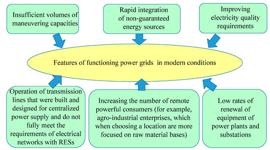The forecasting process precedes the process of analyzing the instability of RES generation, namely the identification of the most influential meteorological factors, so this article is devoted to the analysis of the instability of RES generation in the control of electrical networks. So, features of functioning power grids in modern conditions are shown in Figure 7 and were created with the analysis papers taken into account [24,25,26].