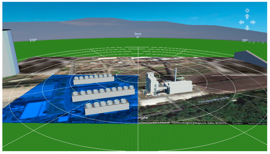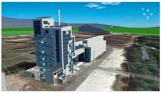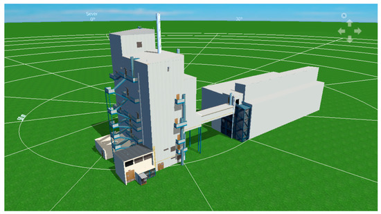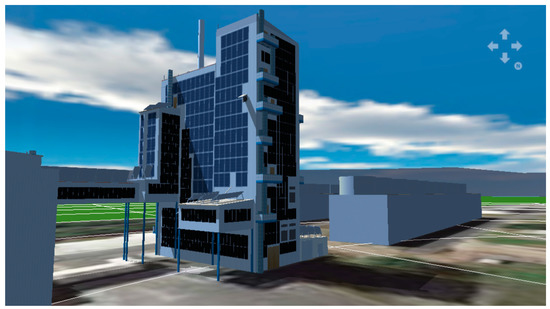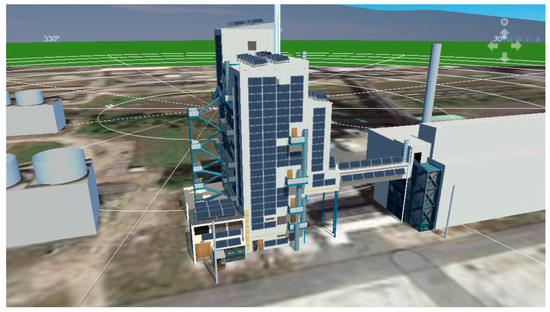 The model of the unit itself is made up of several separate objects that are graphically described (building low, building high, and so on). Individual mounting surfaces are supplemented with details that affect the use of the surface or the creation of shadows (blinds, vents, etc.). Mounting surfaces also contain individual protective zones (lightning conductors, gas, edges of buildings, etc.). If part of the mounting surface is covered by an adjacent object, this area is filled with a forbidden area to allow the use of automatic tools for creating PV systems. Individual mounting surfaces and important functional elements are also mnemonically described in the model for easy orientation. For a better overview of the overall situation, the individual elements are textured using textures obtained from the captured photos. The created model of the industrial building is shown in Figure 12, and the overall situation is shown in Figure 14 and Figure 15.