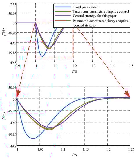 - The existing J and D coordinated adaptive control is optimized. The droop coefficient and virtual inertia can be adjusted in real time according to the system frequency state, and the damping coefficient can be changed cooperatively according to the corresponding relationship. The three are always coordinated and adjusted during the change process, which effectively improves the dynamic performance of the system frequency. The effectiveness and reliability of the proposed multiparameter cooperative adaptive control strategy have been verified by simulation.