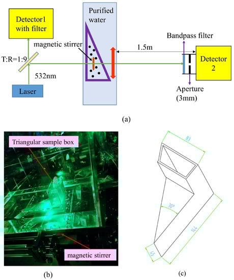 A magnetic stirrer was placed in the triangular box, and the sedimentation of polystyrene particles can be prevented by continuous stirring. The laser light, after passing through the polystyrene solution, was received by detector 2; in addition, a bandpass filter with a center wavelength of 532 nm and an aperture of 3 mm diameter was placed in front of detector 2. The diameter of the polystyrene that was used and the optical length l are listed in Table 1.