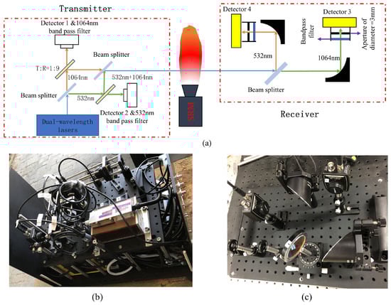 In the transmitter, the dual-wavelength laser-emitted laser beams had wavelengths of 532 nm and 1064 nm simultaneously. The two lasers’ wavelengths were separated after passing through the beam splitter, which reflected the 532 nm laser and transmitted the 1064 nm laser. The two separated lasers again passed through each beamsplitter, whose ratio of transmission to reflection, T:R, was approximately 1:9. The transmitted laser light was received by detectors 1 and 2, in front of which the corresponding bandpass filters were placed. Both the 532 nm and 1064 nm reflected lasers became collinear lasers again after passing through the beamsplitter.
