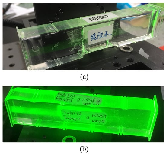 In order to verify the accuracy of the particle size measurement taken using a dual-wavelength extinction method, the particle size of the alumina powder was measured using this experimental setup, and the measurement results were compared with the results measured by the Malvern laser particle size analyzer (MASTERSIZER 2000). The alumina powder needed to be dispersed when measured by the dual-wavelength extinction method; however, it could not be suspended in water because the density of alumina is about 4 times that of the water. Therefore, the alumina particles were cured in an epoxy resin. When the alumina particles were in the epoxy, the absorption effect of the epoxy on the laser had to be taken into account. To calculate the absorption of the laser light by the epoxy resin, an epoxy resin sample that did not contain particles was also made; the epoxy resin samples are shown in Figure 3. The sample in Figure 3a contained no aluminum oxide particles, whereas the sample in Figure 3b contained aluminum oxide particles. The two samples were identical in size, and the sample without alumina particles, shown in Figure 3a, was used to calibrate the absorption of the laser light by the epoxy resin; i.e., if a laser with an intensity of changed to after passing through the sample without alumina and to after passing through the sample containing alumina, the intensity ratio of the light caused by the alumina particles in the sample would be .