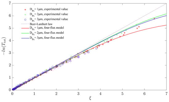 where is the parameter that should depend on the geometry of the sample box; however, this would be difficult to analyze theoretically for a complicated structure. The value of was determined by fitting the polystyrene data with a diameter of 1 m using Equation (18), where was the only fitting parameter; thus, was . This value was then used to determine the predicted values under the four-flux model of the transmittance of the polystyrene particles for diameters of 2 and 3 m. The experimental transmittance values for the different particle sizes and optical thicknesses and the theoretical values of the four-flux model are shown in Figure 4.