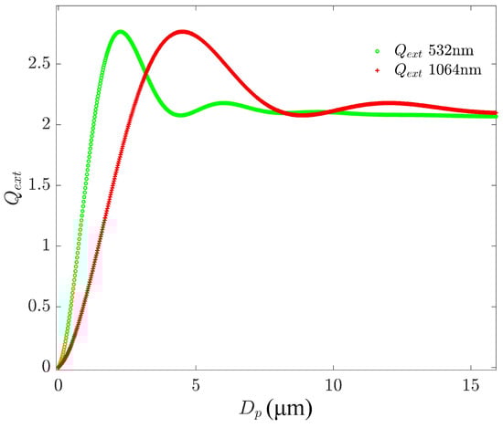 To invert the particle size distribution using the LEM, the extinction coefficient needed to be calculated. The complex refractive indices of the alumina for the laser lengths of 532 nm and 1064 nm ( and , respectively) for this calculation using Mie theory were [38,39]: