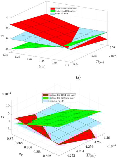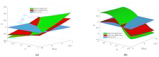 The surfaces of the functions in Equations (26) and (27) could be plotted with respect to the particle size distribution parameters; then, the intersection of these two surfaces with the plane of “Z = 0” was the solution of Equation (23).