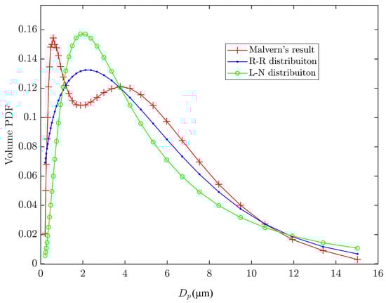 The volume PDF comparison between particle size measurement results of R-R and L-N distribution obtained by the LEM and those of the Malvern laser particle size analyzer.