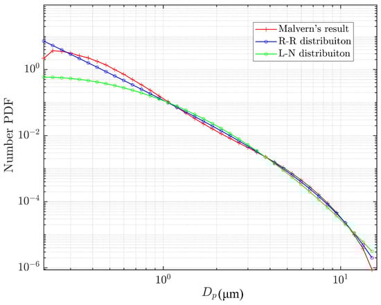 The comparison between the particle size measurement results of the R-R and L-N distributions obtained by the LEM and those of the Malvern laser particle size analyzer is shown in Figure 7. To view the size distribution of the small particles, the particle number probability density function (PDF) was also calculated, as shown in Figure 8.