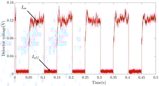 In this section, the particle size in the SRM plume was measured using the LEM. The transmitted laser passing through flame could be received with the help of off-axis parabolic mirrors in the receiver. In this experiment, a laser was operated in pulse mode to eliminate the influence of flame radiation on the measurement results. The detector signal for the 1064 nm laser at the receiver is shown in Figure 9 when the pulsed laser transmitted the SRM plume. In Figure 9, was the detector value when there was a laser output, and was the detector value when there was no laser output, as introduced earlier. From this figure, it can be seen that the detector value was very small, at about 6 mV, and almost equal to the detector’s dark voltage, although the brightness of the SRM plume was very high. The reasons for this included the fact that there was a narrow bandpass filter in front of the detector and that the acceptance angle of the detector was very small. This resulted in a very limited effect of the SRM plume radiation on the detector at the receiver end. The effect of plume radiation could be eliminated by subtracting from . The data of the 532 nm laser was treated in the same way.